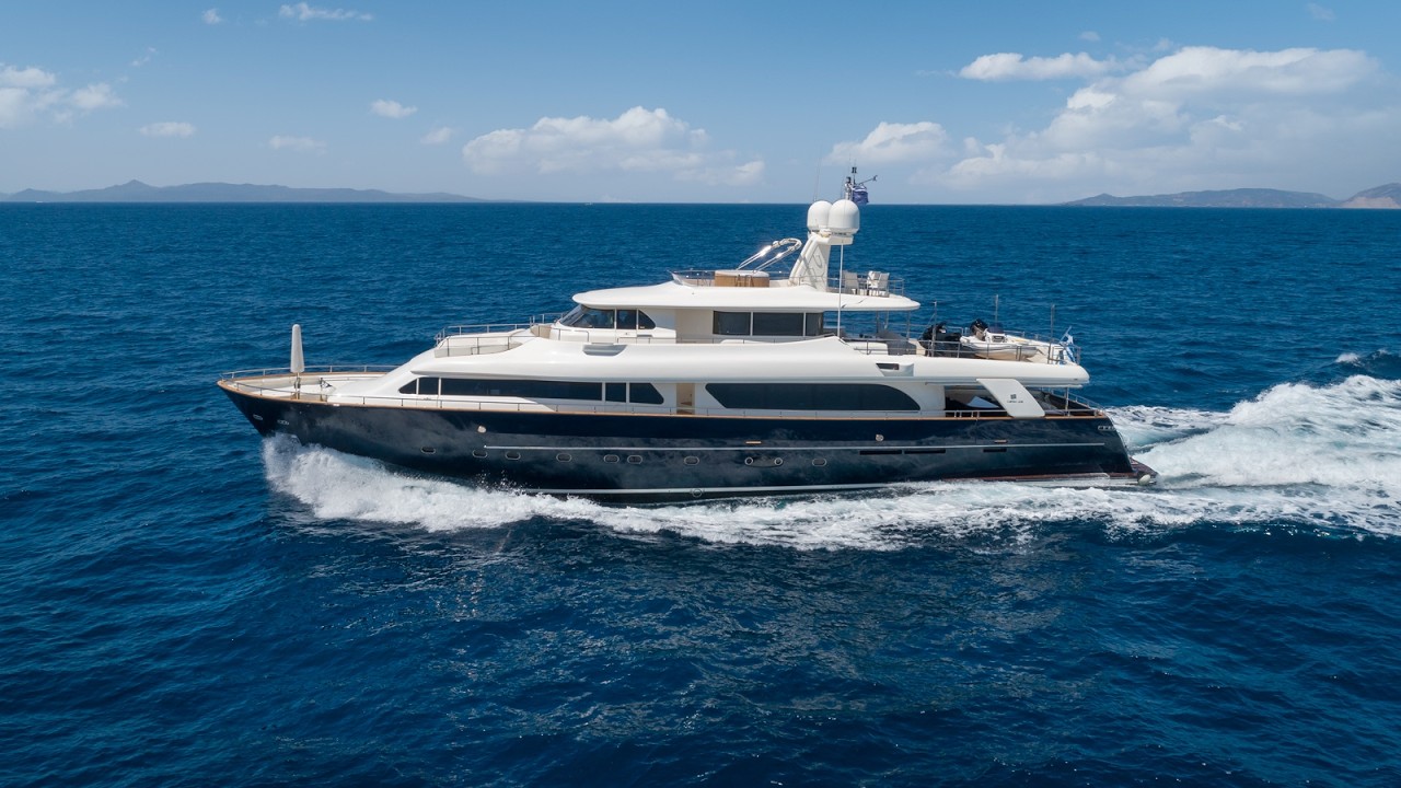 The interior comfortably accommodates (10) guests in (4) cabins consisting of a Master suite amidships full beam, a VIP suite forward, and (2) twin cabins with single berths convertible into double ones plus an additional Pullman bunk in each, all with private bathrooms. She also accommodates (6) crew members in (3) cabins with facilities in separate quarters. The spacious cabins are complemented by large daytime areas both inside and out. The upper deck provides a TV lounge and ample seating and lying areas on deep sofas.